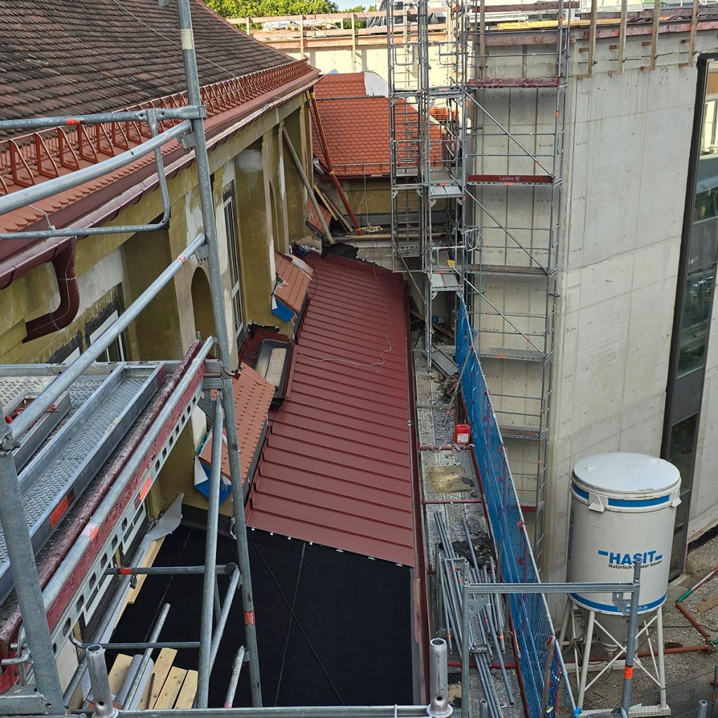– 900qm Dacheindeckung Doppelstehfalz Aluminium Oxydrot mit Holzschalung